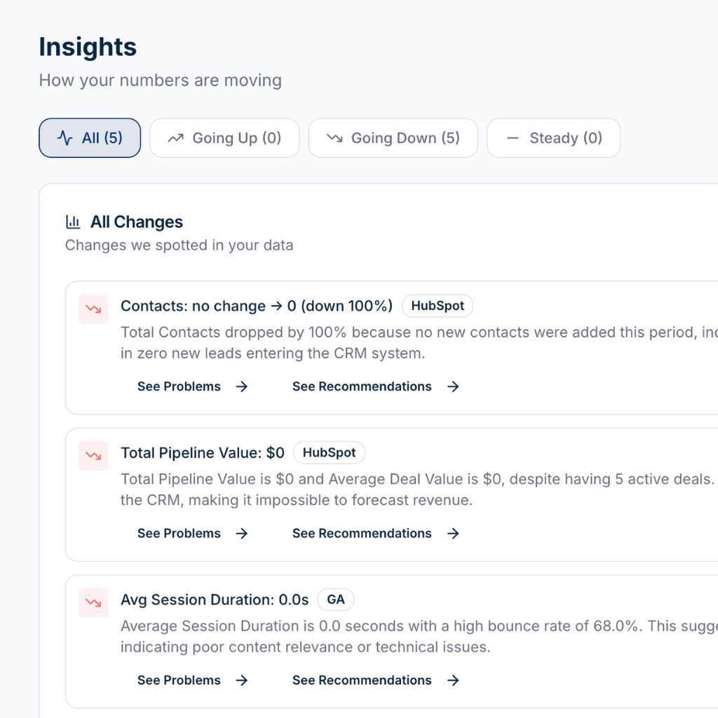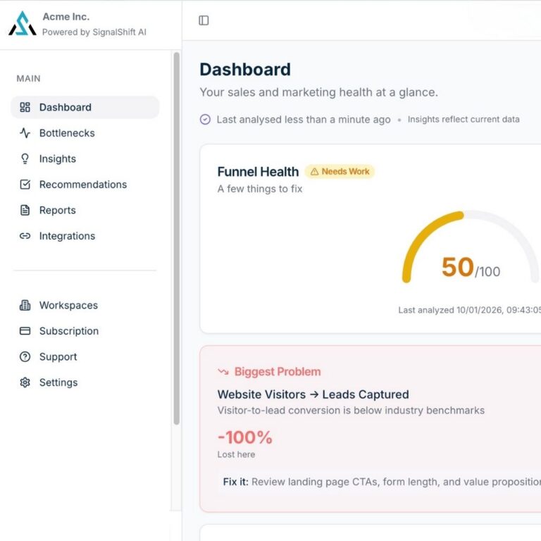 SignalShift AI applies intelligence across your entire funnel, not just individual metrics. It understands how sales and marketing signals interact, helping businesses see where momentum breaks down and what to focus on first.